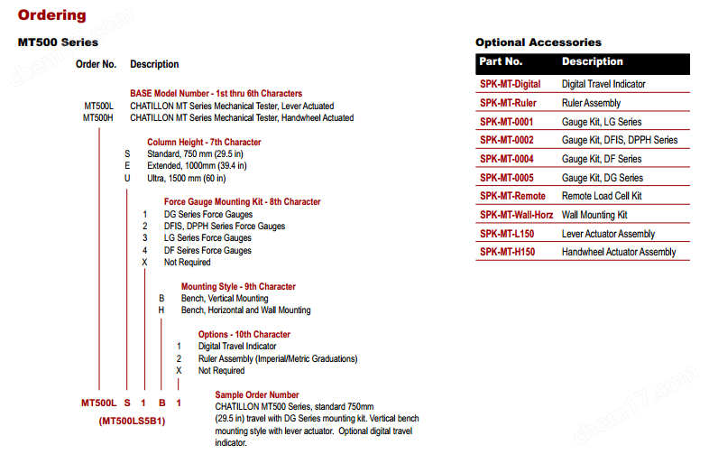 Chatillon机械力测试仪Chatillon MT 系列手动测试机架是灵活易用的负载测试解决方案。它有两种型号:MT150 为 150 lbf(660 N)规格,MT500 为 500 lbf(2.5 kN)规格。 MT 系列主要特点:- 易于使用- 紧凑型,轻巧台式设计,可置于台面或挂壁- 可水平放置- 可选柱高(750、1000 和 1500 毫米)