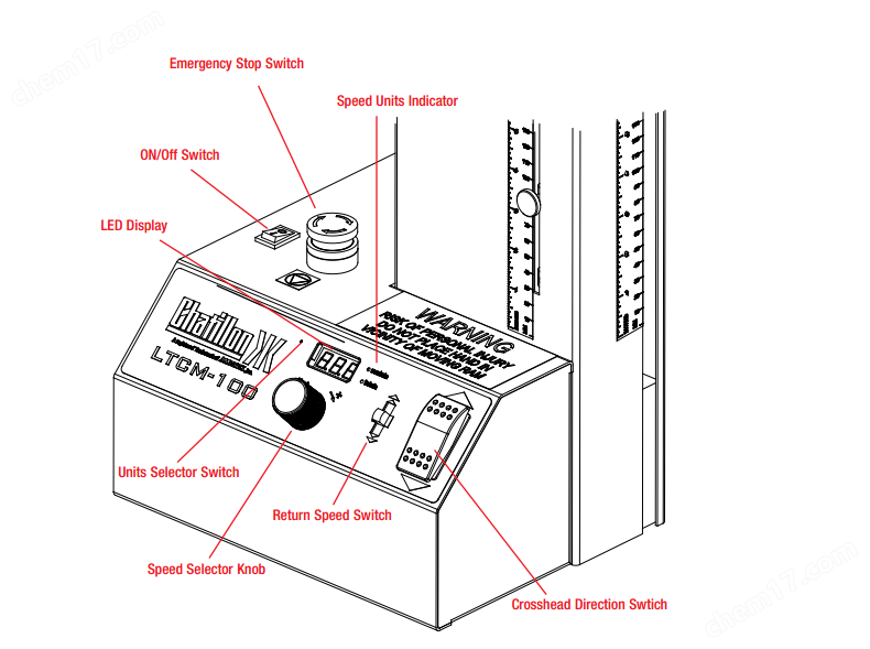 ? The LTCM Series has a moving crosshead! Exercise extreme caution during testing or whenever the crosshead is moving. Never place