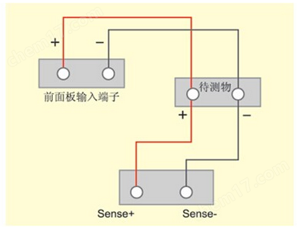 在CC,CV,CR,CW模式下,当负载消耗较大电流的时候,就会在被测仪器到负载端子的连接线产生压降。为了保证测量精度,同惠负载在后面板提供了一个远程量测端子,用户可以用该端子来测量被测仪器的输出端子电压。远程操作:SENSE(+)和SENSE(-)是远程输入端子,为了减少负载输入导线过长引起的压降,用户可将SENSE线连接到待测物正负输入端,以提高测量精度。远程量测得接线示意图如下: