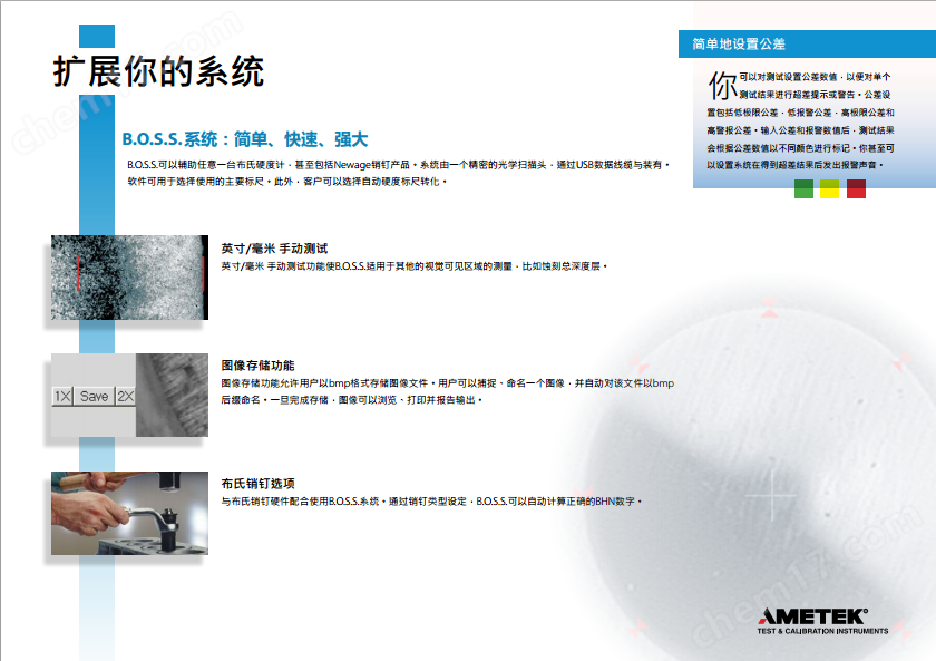 Newage光学扫描布氏硬度计Newage 的B.O.S.S. 为一款布氏光学扫描系统,其中包含一个高清晰度视频扫描头和成像软件,确保快速、准确、一 致地读取所有布氏压痕。